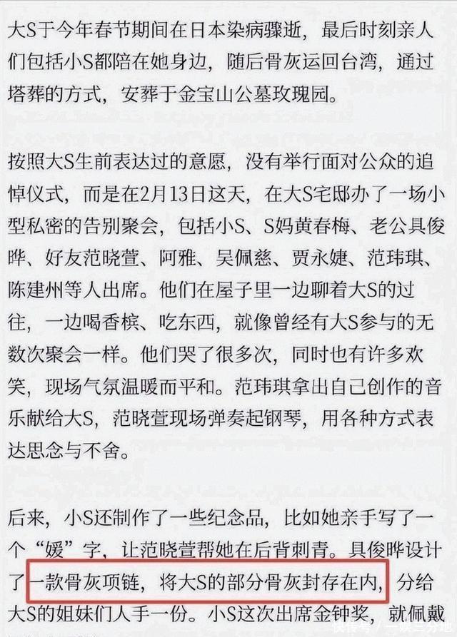 金钟奖后第5天,汪小菲一句“思念不是给镜头看的”,把小S纪念大S的专访推上风口浪尖,关于“真诚哀伤还是情感营销”的争论瞬间炸开 那晚的画面其实还留在很多人心里 黑色丝绒长裙,裙摆上的铃兰,像是把姐姐最爱的花别在心口